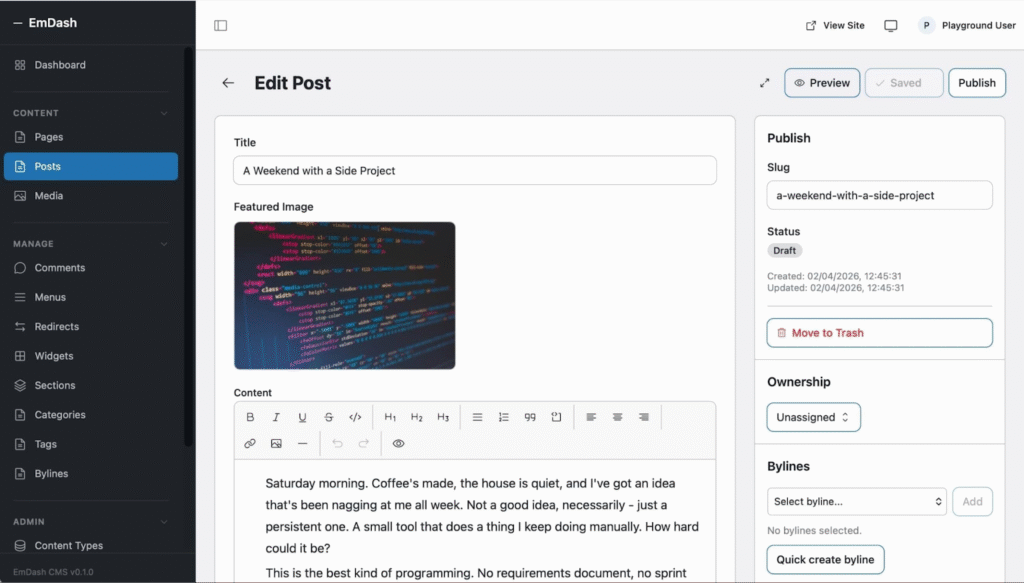 At a basic level, EmDash helps you create and manage websites, just like WordPress. The difference is in how it works behind the scenes.