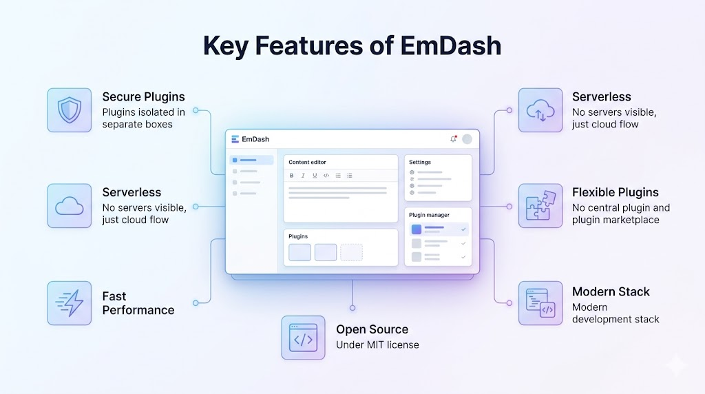 EmDash focuses on fixing common pain points seen in traditional systems like WordPress. Here are the key features that define how it works: