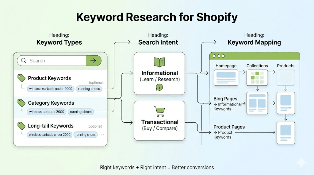 Keyword research decides who finds your store and for what reason. If you target the wrong terms, you may get traffic but no sales. The goal is to match what people are searching with what you are selling.