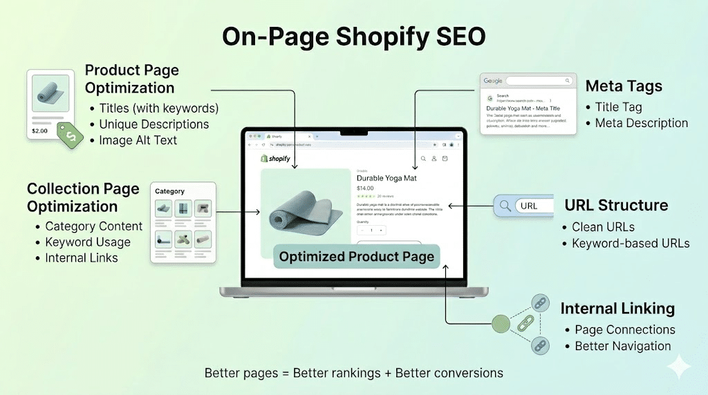 Shopify SEO covers three areas: on-page work like titles and descriptions, technical work like site speed and crawlability, and off-page work like building backlinks. All three matter.