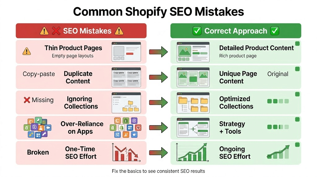 Thin or duplicate content on product pages is one of the most common reasons Shopify stores struggle to rank.