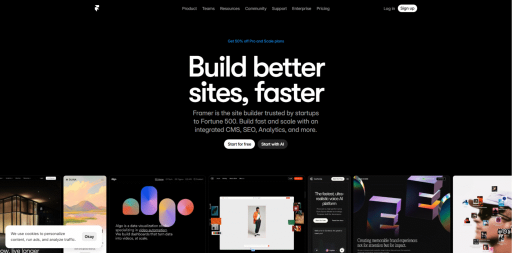 Framer is a no-code/low-code site builder aimed at designers, creatives, and small teams. It offers a visual design canvas plus CMS, hosting, and built-in collaboration tools so you can build marketing sites, portfolios, landing pages, or small business sites without writing code. Publishing is fast, and it supports responsive layouts and modern styling out of the box.